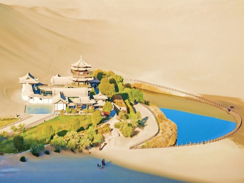 - Suối Nguyệt Nha- Minh Cát Sơn là một trong 5 khu sa mạc đẹp nổi tiếng của Trung Quốc, Minh Cát Sơn xếp thứ 4, bãi sa mạc đã có từ hai nghìn năm mà suối Nguyệt Nha nằm trong khu vực sa mạc không bị khô cạn, dài 218 m từ Đông tới Tây và rộng 54m từ Bắc tới Nam, chứa trong lòng nó là làn nước trong xanh như nước mùa xuân ngay giữa vùng sa mạc. Kế bên hồ là một ngôi chùa cổ, một hàng cây xanh rủ bóng mát cùng các cửa hàng lưu niệm. Du khách tới đây không chỉ vì hiếu kì sự tồn tại của một ốc đảo xanh tươi giữa sa mạc mà còn được cưỡi trên lưng lạc đà giữa sa mạc mênh mông để chiêm nghiệm lại cảm giác của người xưa khi di chuyển trên “ Con đường Tơ Lụa” (Chi phí cưỡi lạc đà 100ndt tự túc)
